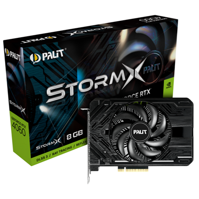 Palit GeForce RTX™ 4060 StormX: The incredibly small package contains the mighty power of a full-sized graphics card. With only 17cm in length, Palit StormX is perfect for small form factor system. Gamers can experience the 100% performance as a full-sized card while saving space and enjoy the portability., NVIDIA DLSS 3, Ray Tracing, 0-dB Tech